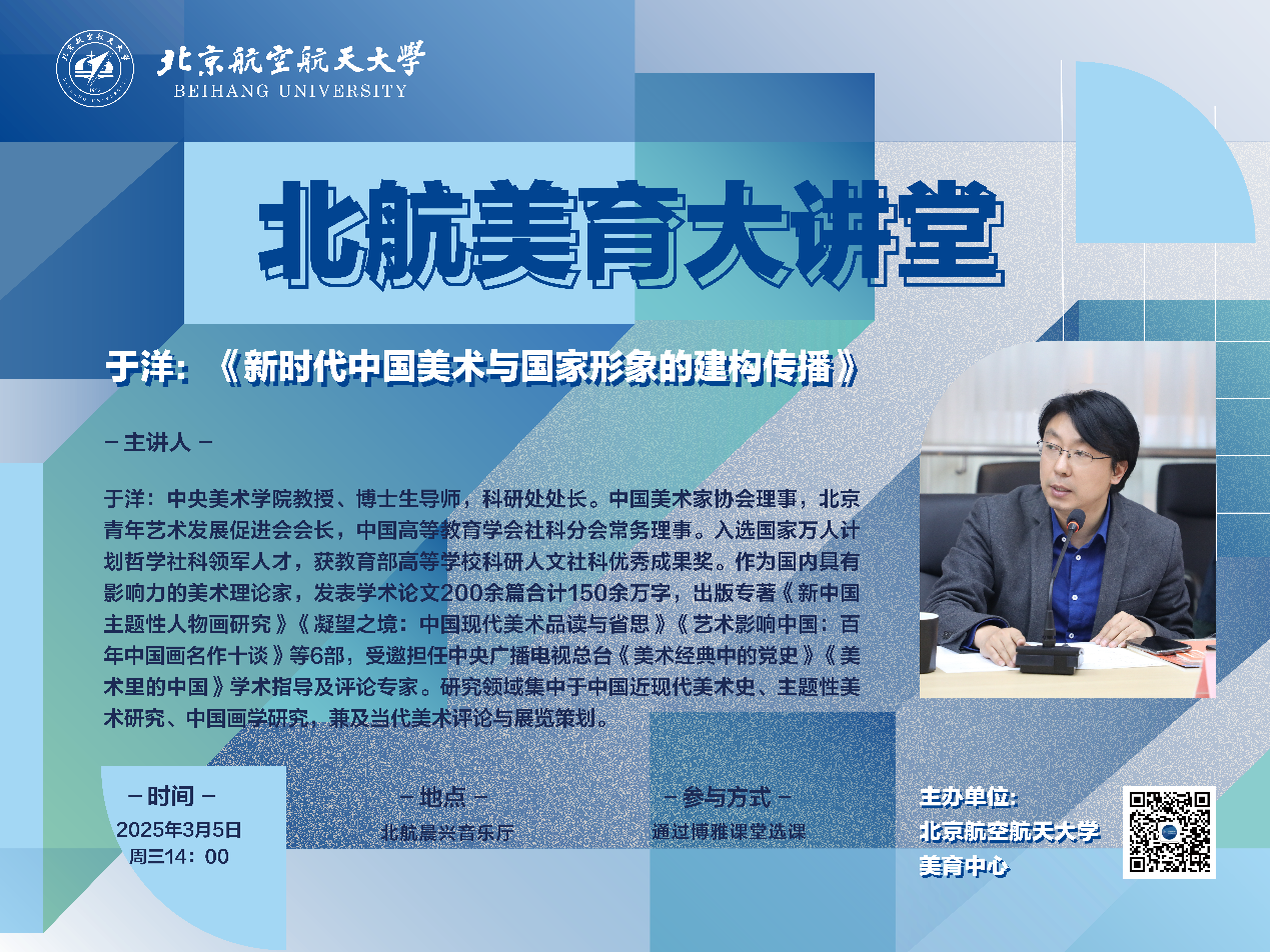 于洋,中央美术学院教授、博士生导师,科研处处长。中国美术家协会理事,北京青年艺术发展促进会会长,中国高等教育学会社科分会常务理事。入选国家级领军人才哲学社科领军人才,获教育部高等学校科研人文社科优秀成果奖。