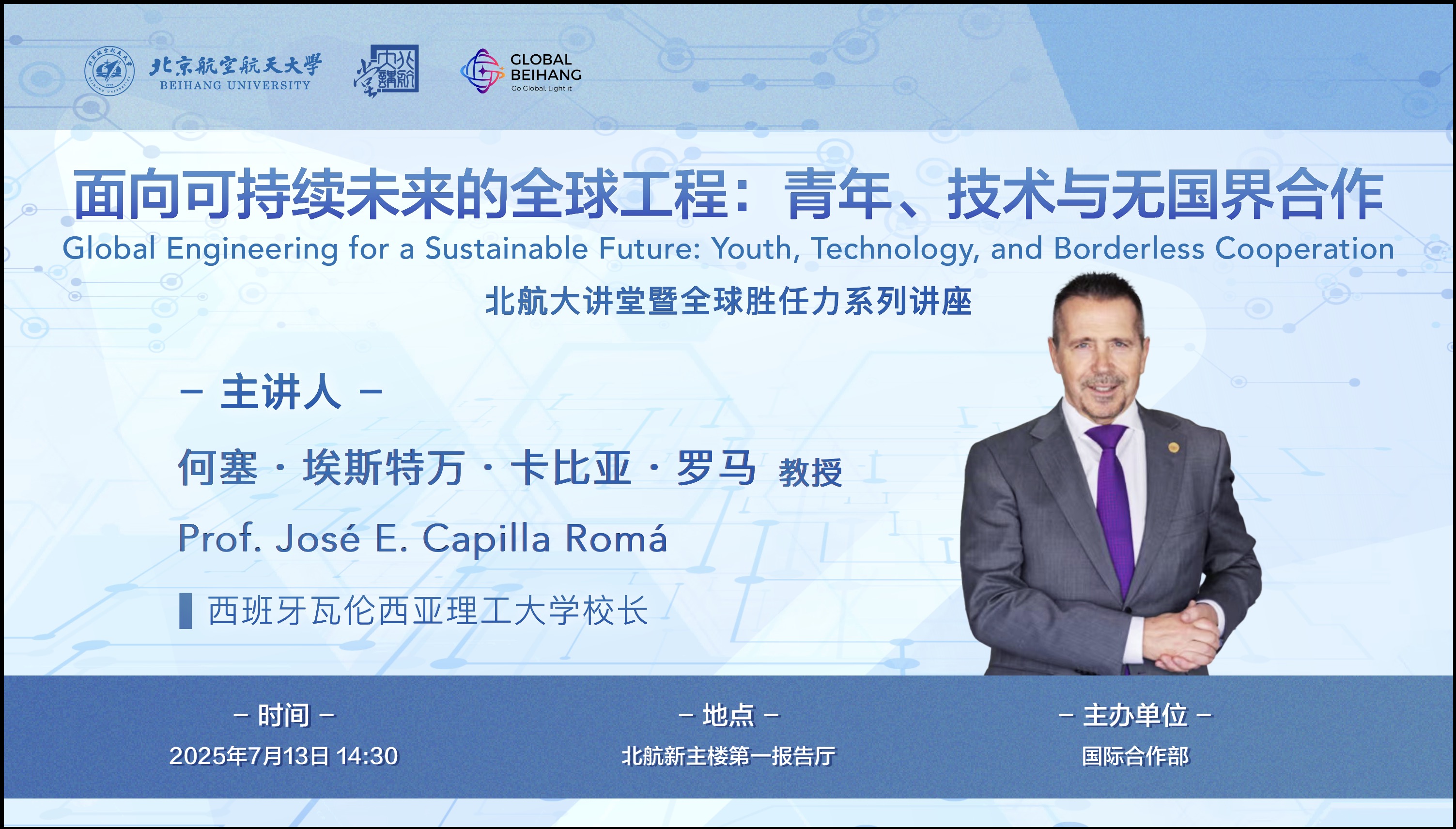 本次特邀讲座是西班牙瓦伦西亚理工大学何塞・卡比亚校长在访问(中国)科技公司期间为师生们带来的主题讲座,将探讨在日益互联互通的全球化世界中,大学在塑造人类发展、技术进步与伦理建设方面的变革性作用。讲座强调,当今的工程与科学挑战具有全球性,国际化已非可选项,而是任何有志于产生重大影响的专业人士必备的核心能力。