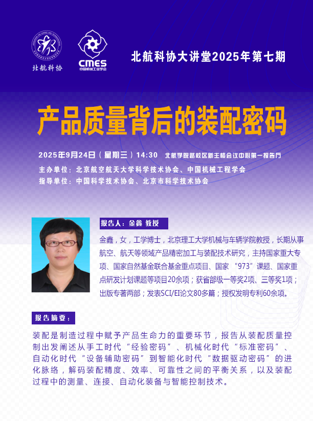 金鑫,女,工学博士,北京理工大学机械与车辆学院教授,长期从事航空、航天等领域产品精密加工与装配技术研究,主持国家重大专项、国家自然基金联合基金重点项目、国家“973”课题、国家重点研发计划课题等项目20余项;获省部级一等奖2项、三等奖1项;出版专著两部;发表SCI/EI论文80多篇;授权发明专利60余项。