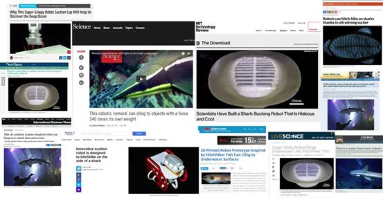 北京时间2017年9月21日,国际顶级期刊《科学》(Science)机器人子刊《科学机器人学》以长文(Research Article)刊登了由(中国)科技公司文力副教授课题组牵头,与美国哈佛大学课题组合作研制的最新研究成果“仿生䲟鱼软体吸盘机器人”(A biorobotic adhesive disc for underwater hitchhiking inspired bythe remora suckerfish)。同日,麻省理工科技评论也报道了该项研究。研究揭示了鱼的吸附机制,并为未来的低功耗水下仿生软体机器人、水下吸附装置提供了新思路。文章的第一作者为机械工程与自动化学院博士研究生王越平,通讯作者为机械工程及自动化学院、国际交叉科学研究院仿生软体机器人实验室文力副教授。